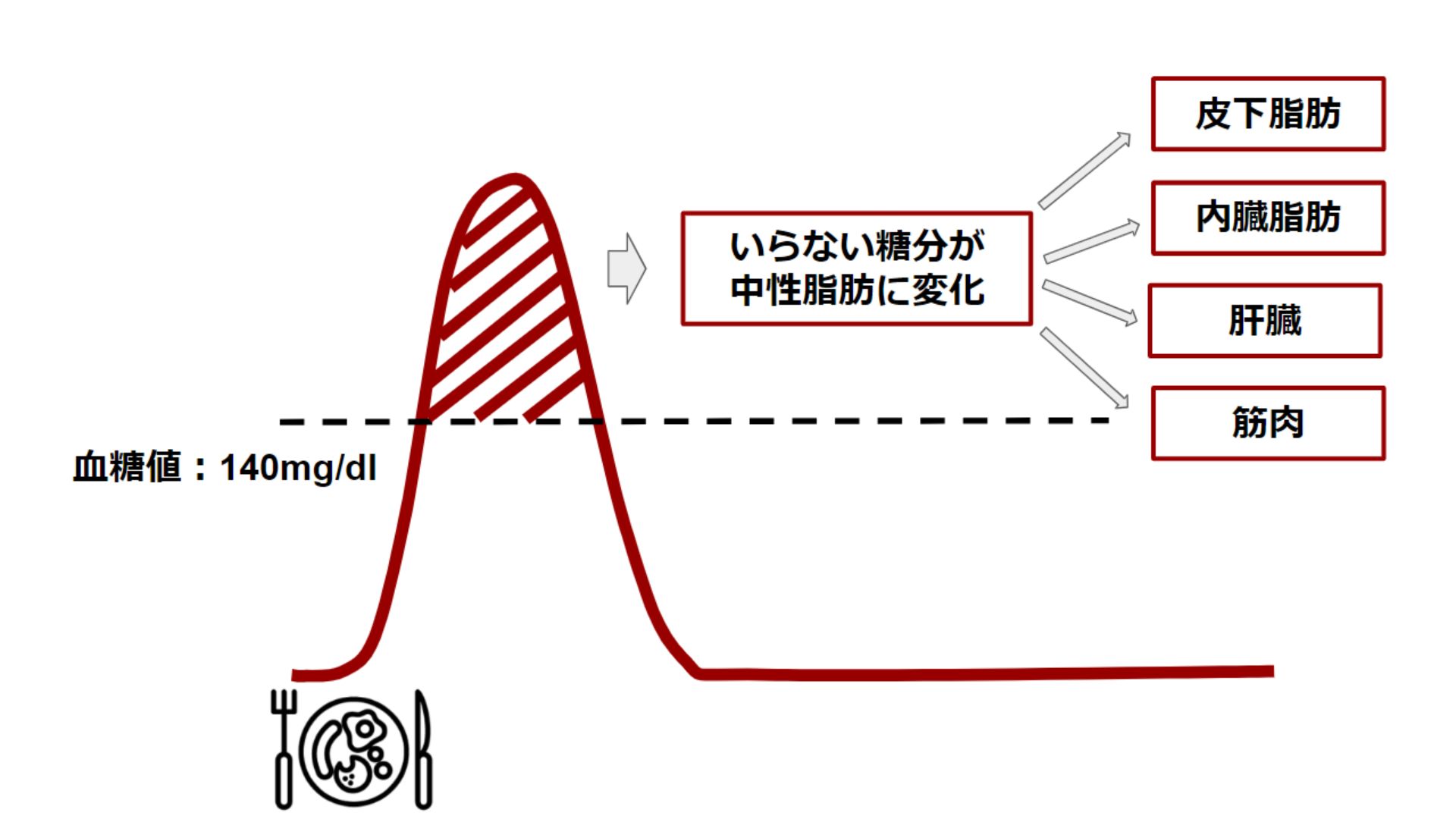 食後に血糖が過度に上昇してしまうと、肝臓で糖がアブラ(中性脂肪)に変換されます。