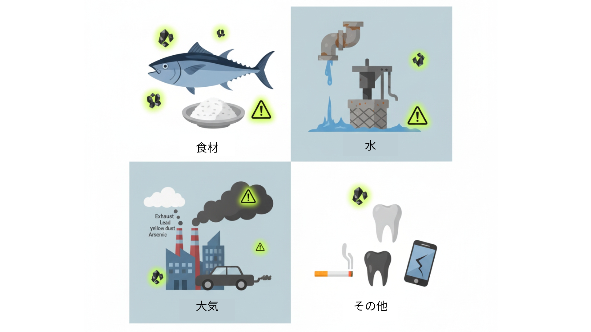 ● 大気: 工場の排気や黄砂などに含まれる金属類を吸い込む可能性があります。
