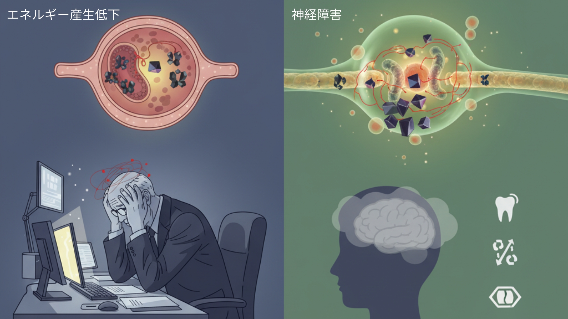 これらは、重要な場面における判断力や対人関係にも影響を及ぼしかねません。有害重金属は、私たちの「脳のパフォーマンス」にも静かに影を落とすのです。