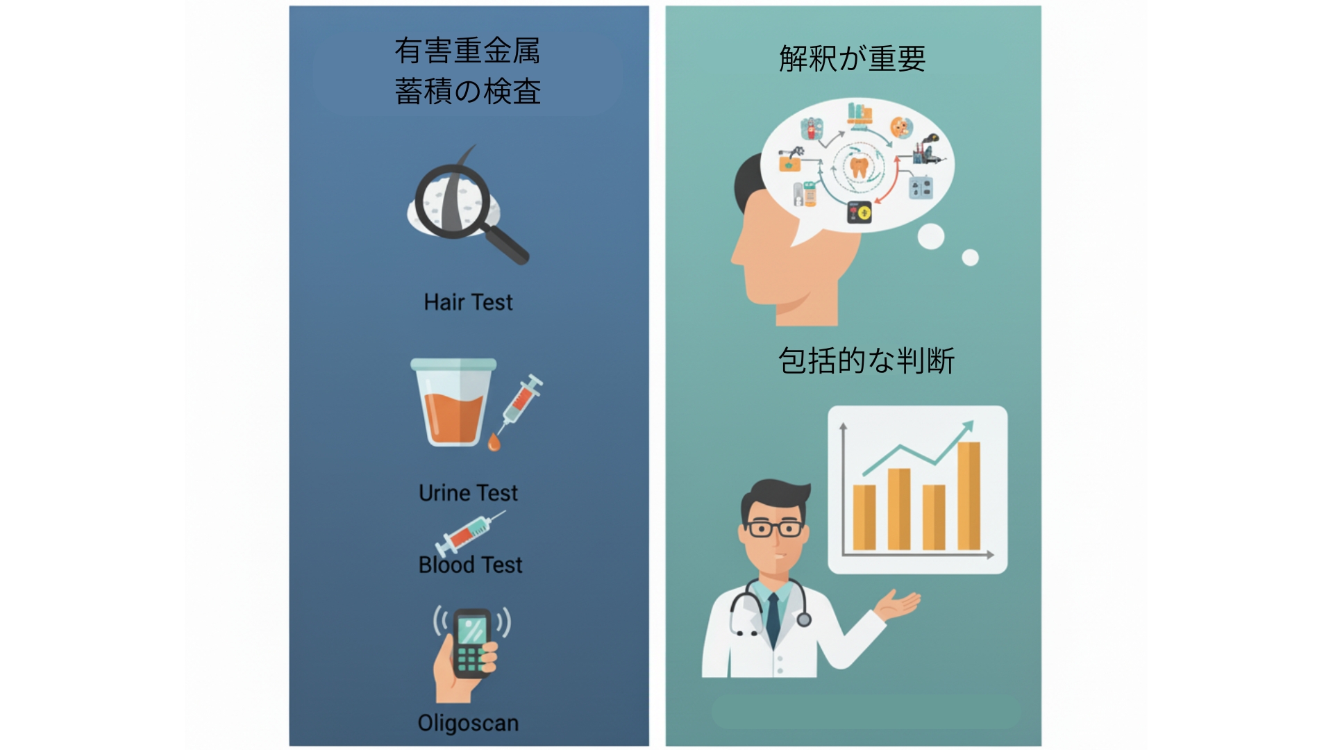 例えば、毛髪検査で数値が低い場合でも、それは「体外に排出する力(デトックス力)が弱まっている」ために髪の毛に出てこない、という可能性も考慮する必要があります。