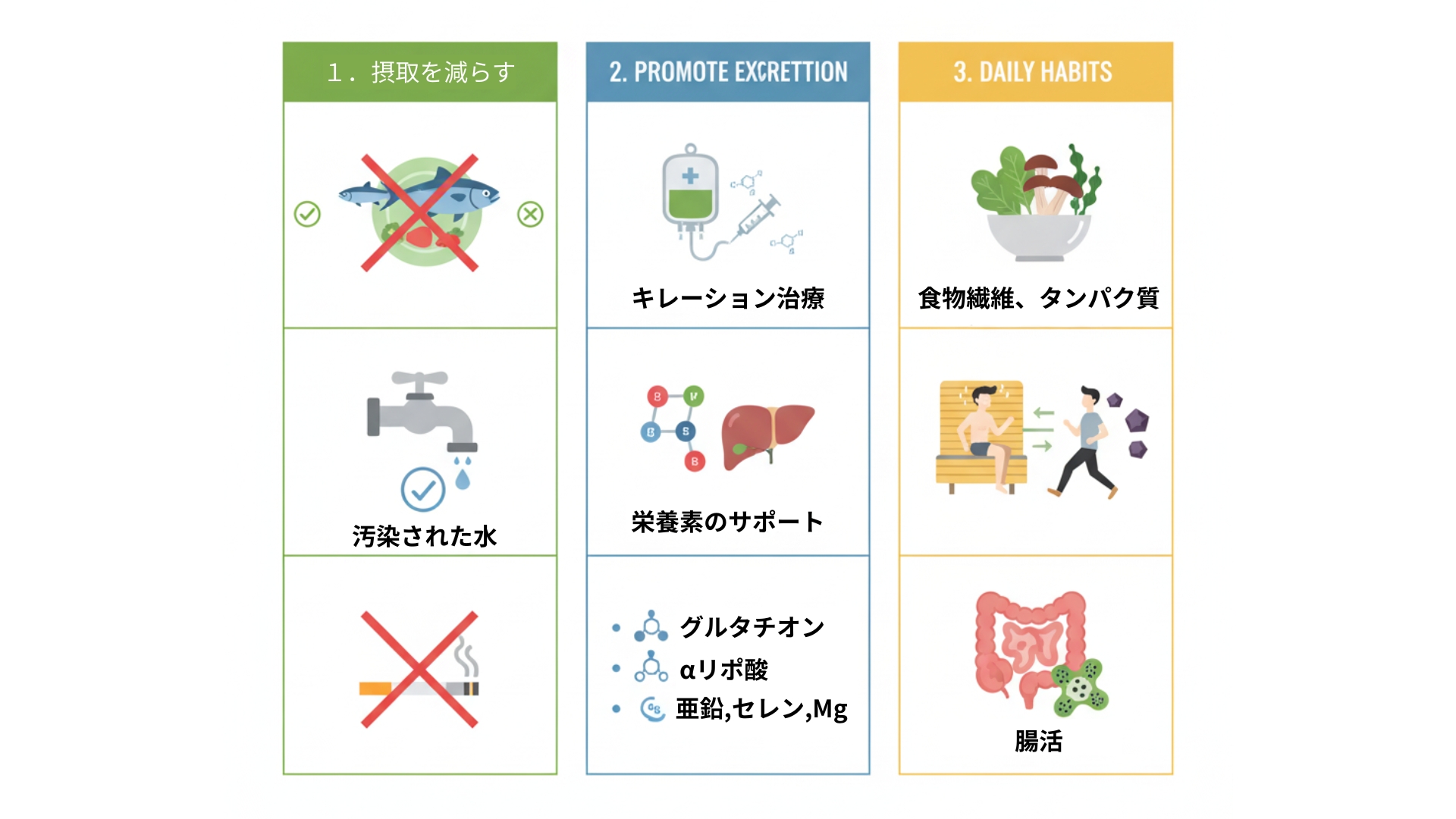 まずは、これ以上有害重金属を体内に取り込まないよう、生活習慣を見直すことが最優先です。